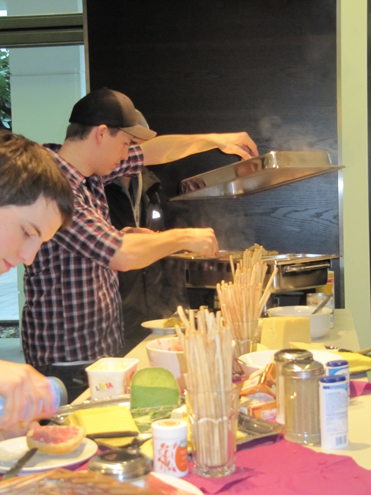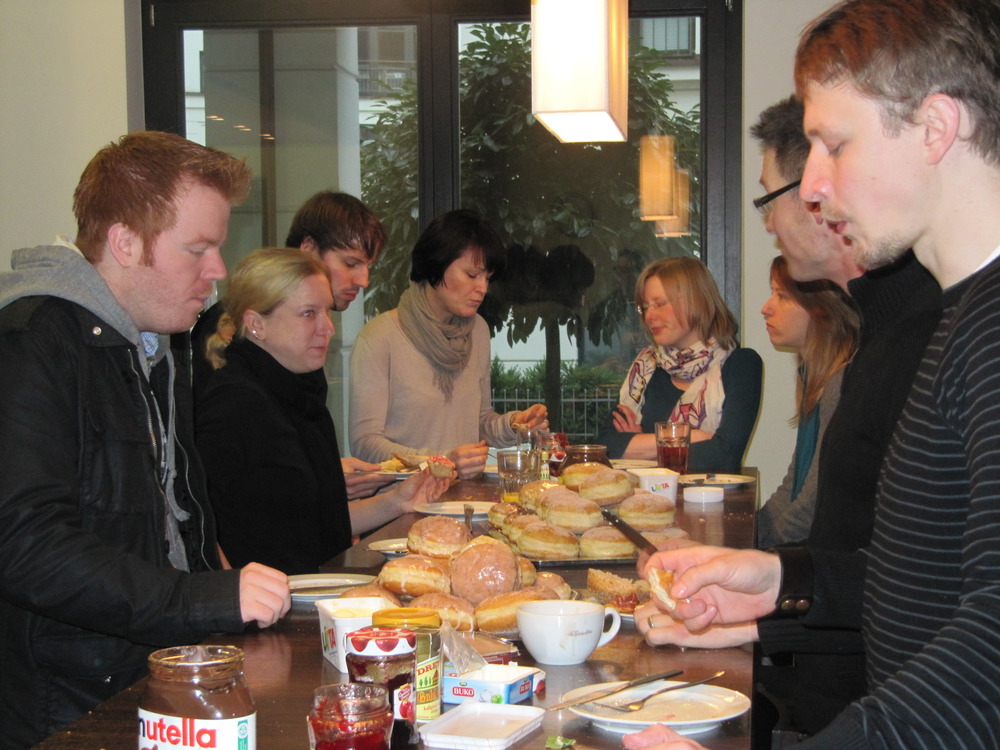Eigentlich wollten wir, das sind Aniko, Claudia, Dirk & ich vom Büroorga-Team, unsere Kollegen gleich zu Beginn des neues Jahres zu einem standesgemäßen Neujahrsfrühstück einladen. Hat aber zeitlich irgendwie nicht hingehauen. Da wir die Einladung aber nicht aus den Augen verlieren und auch nicht nur irgendein Frühstück organisieren wollten, haben wir unser Frühstück heute einfach unter das Motto „Nichtmehrganzneujahrsfrühstück“ gestellt. Manche Kollegen hatten unsere Einladung über’s Wochendende schon wieder vergessen oder gar nicht gewusst, was sie überhaupt erwartet. Umso schöner war deren Überraschung am heutigen Morgen, statt des täglich üblichen Frühstücks mit Frischkäse und Marmelade heute auch noch Rührei mit Bacon, diverse Käsesorte, Croissants und Berliner vorzufinden. Wir jedenfalls haben mit Freude vorbereitet und uns über die große Teilnahme gefreut und hoffen, es hat geschmeckt.