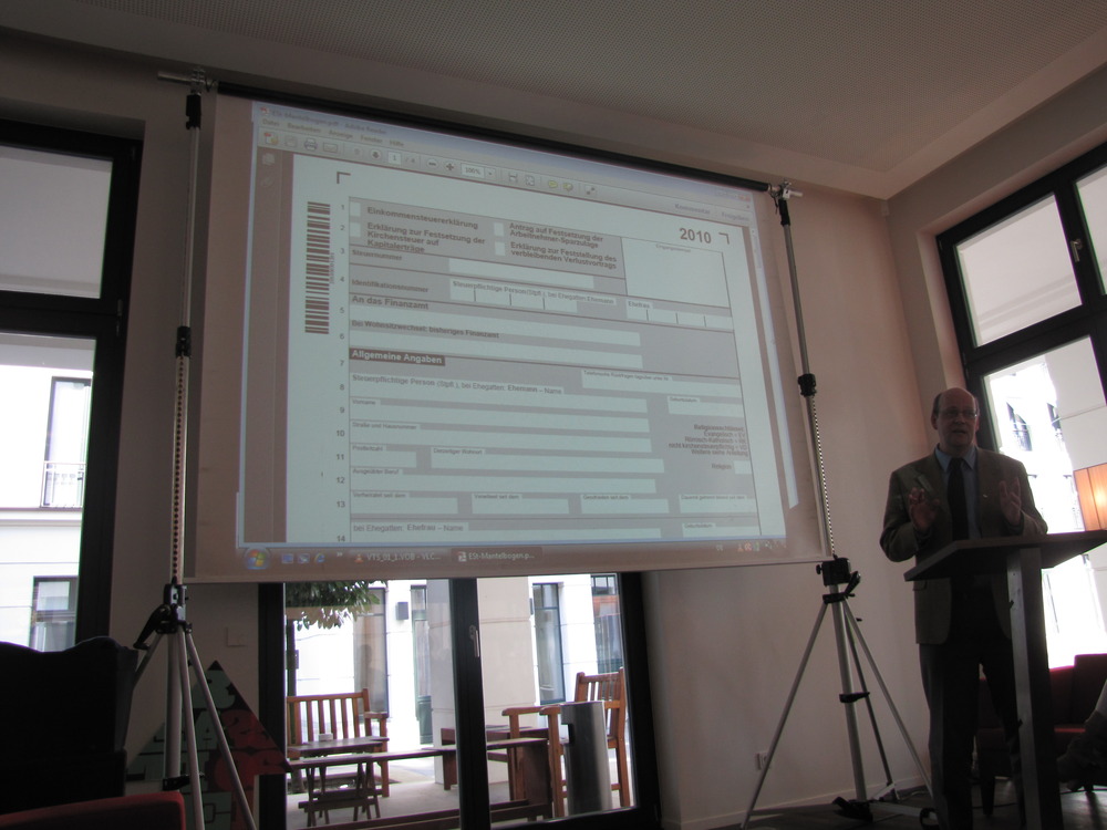 Im Rahmen einer Präsentation klickte sich Herr Jürgens (bzw. sein Sohn) durch sämtliche Formulare der Steuererklärung und alle Anlagen. Dabei erklärte er uns, was wie in die jeweiligen Zeilen eingetragen werden muss und was man so alles absetzen kann (hierfür ist übrigens die Auflistung der mitzubringenden Unterlagen des Lohnsteuerhilfevereins auch ganz hilfreich). Eine Wissenschaft für sich und durch die jährlich wechselnden Formulare für den Laien völlig undurchsichtig.