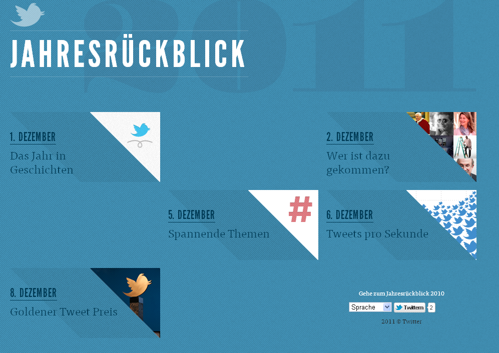 Auch für 2011 gibt es wieder einen Twitter-Jahresrückblick, der in unterschiedliche Sparten aufgeteilt ist. Man kann z.B. sehen, dass der Papst seit dem 29. Juni ein Twitter-Account hat, anlässlich der MTV Music Video Awards 8868 Tweets pro Sekunde versendet wurden und Brian Stelter mit Hilfe von Twitter 34 Kilogramm im letzten Jahr abnahm: